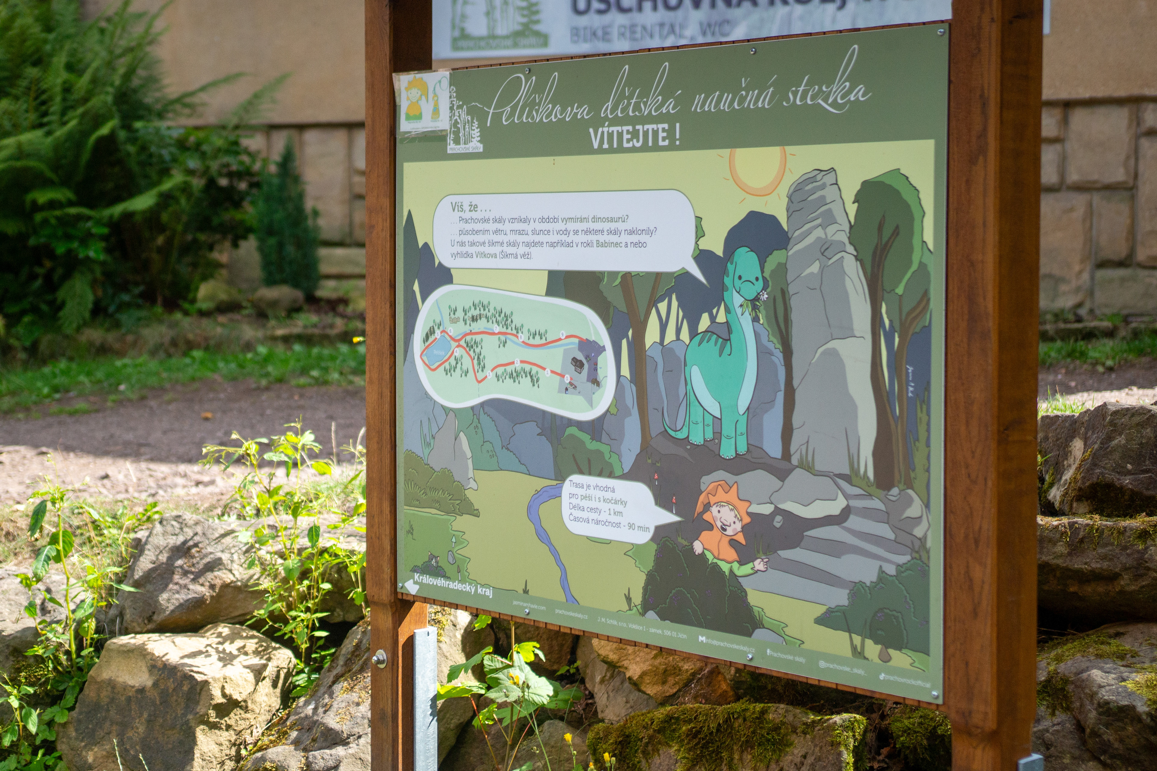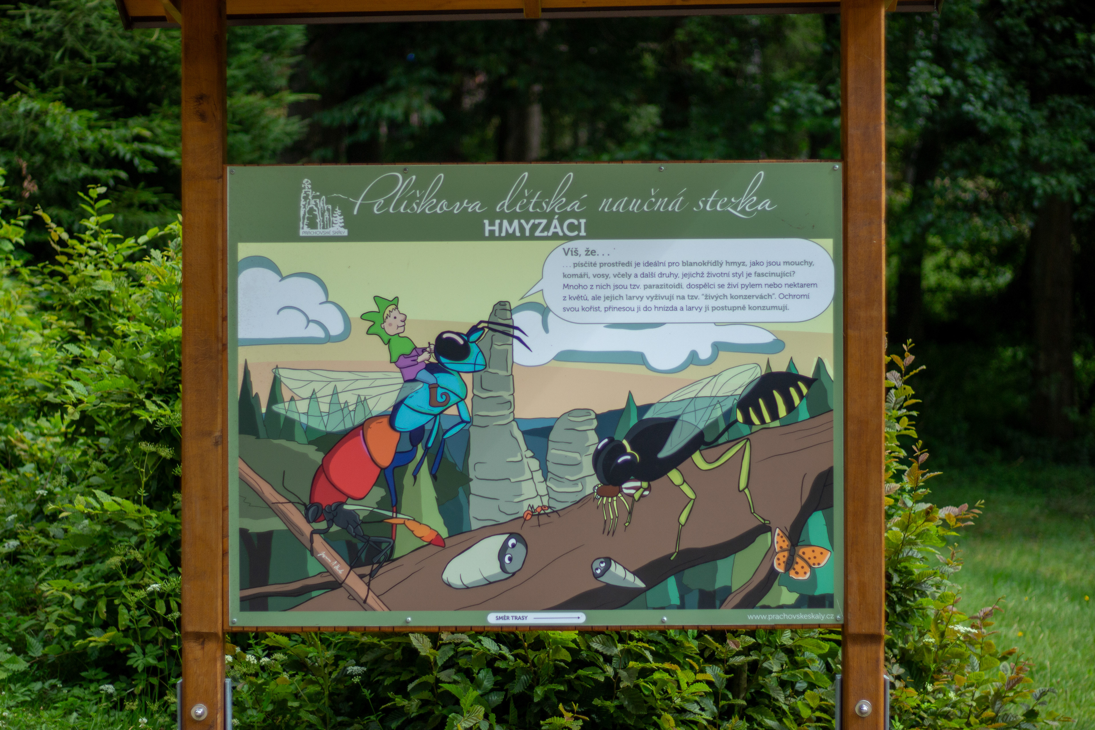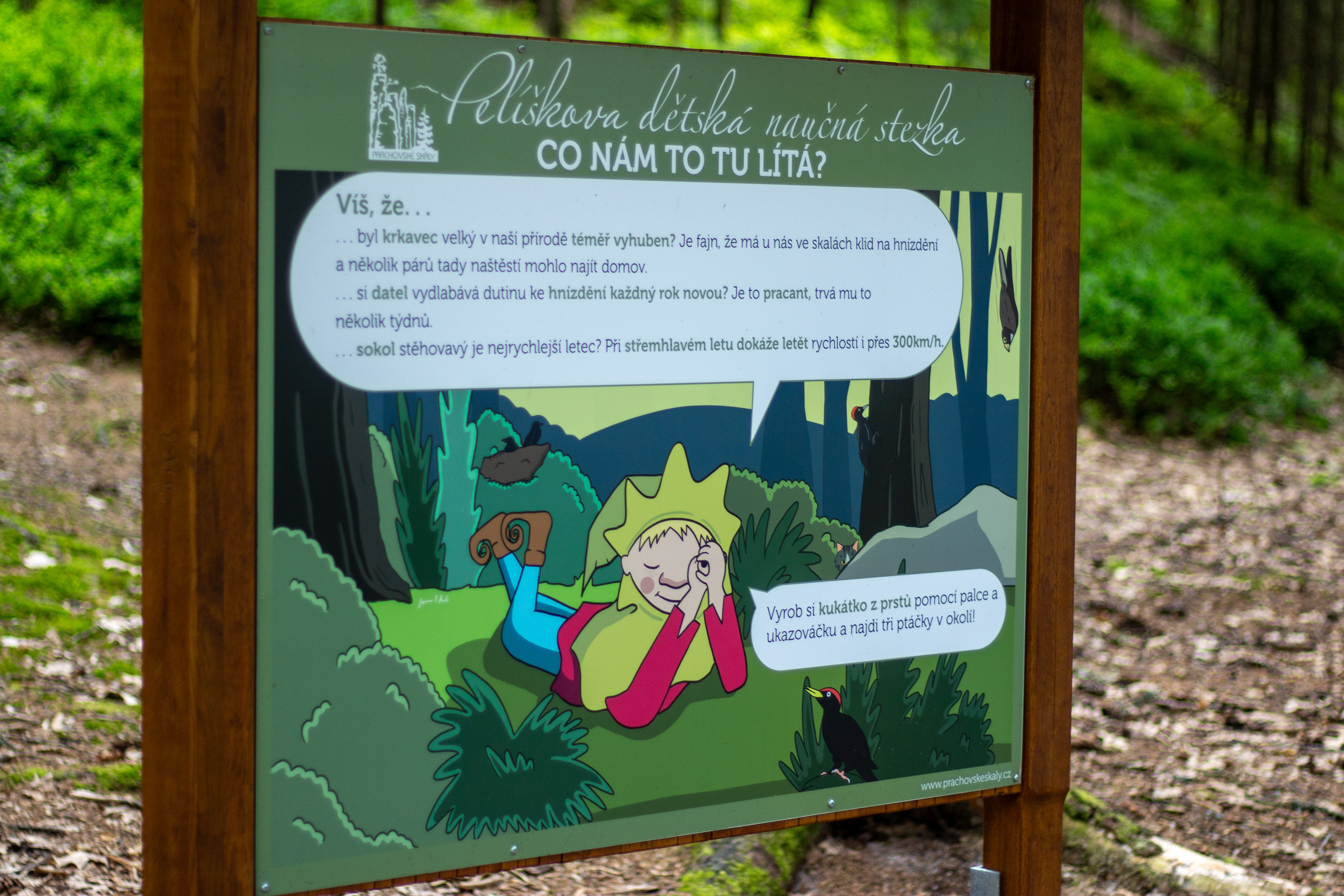 Pelíškova dětská naučná stezka vznikla v rámci projektu v Prachovských skalách. Stezka se odvíjí 1 km okolo rýbníku Pelíšek. Pelíšek je mýtická postava ze skal. Na stezce jsem se podílela celkovou ilustrací a grafickým designem. Jedná se o 10 tabulí. Texty a témata byly dodány Ritou Schlickovou.