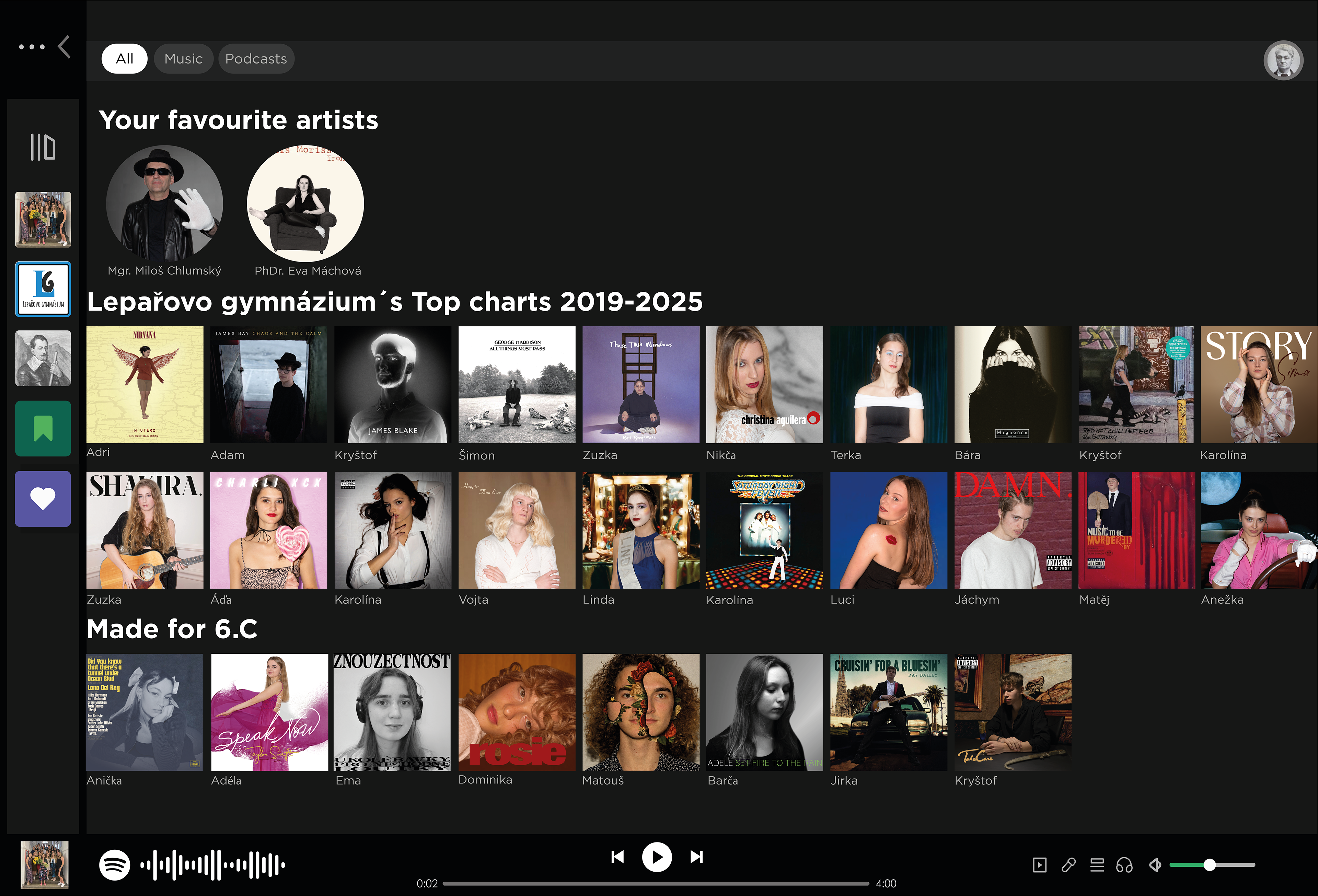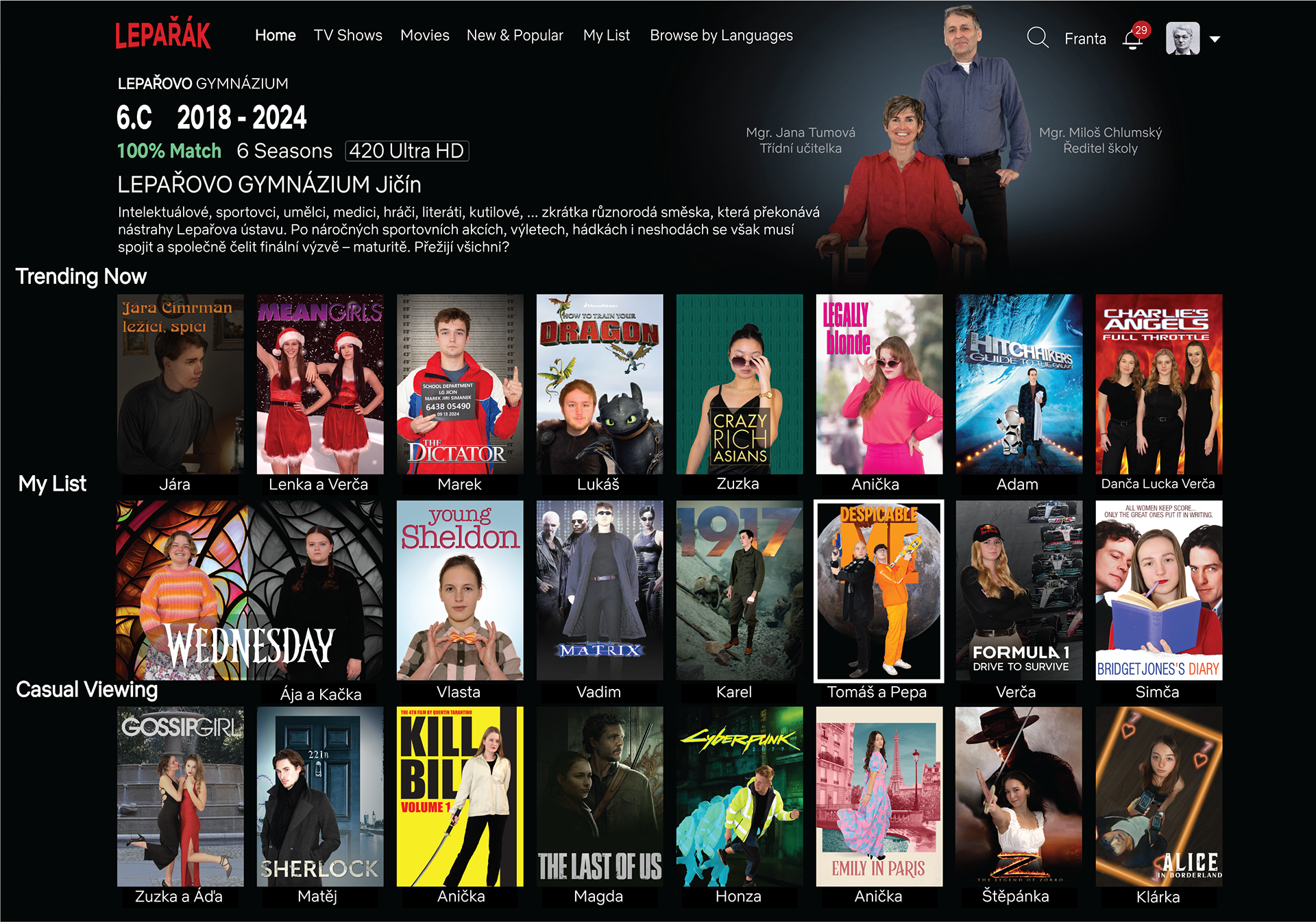 Maturitní tabla na tématiku Netflixu a Spotify. Všechny fotografie jsou nafoceny na zrcadlovku, poté upraveny ve photoshopu. Každý student si vybral své oblíbené album nebo film/seriál, podle kterého obrázky na tabla byly vytvořeny.